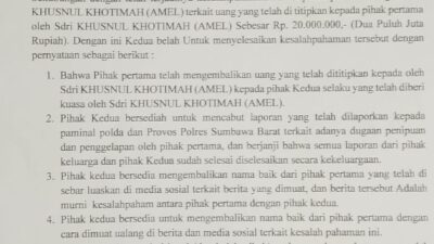 Jereweh KSB, Mediajejakdigital– Dugaan kasus penggelapan uang titipan tahanan yang melibatkan oknum anggota SPKT Polres Sumbawa Barat berinisial RGR, resmi berakhir melalui jalur perdamaian. Persoalan tersebut diselesaikan secara kekeluargaan setelah adanya itikad baik dari pihak RGR untuk mengembalikan seluruh dana kepada keluarga penyetor.